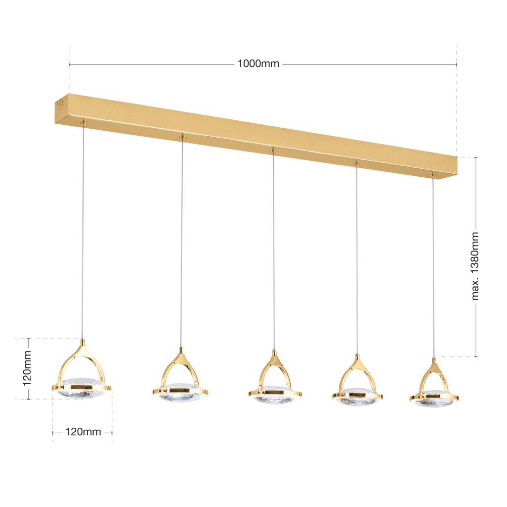 A MOON modern kristály LED függőlámpa, arany, 1500lm megbízható és esztétikus választás otthoni vagy irodai használatra. Stílusát tekintve Modern kristály, arany árnyalatban, fém anyagból készült. Energiatakarékos beépített LED technológiával működik, hosszú élettartammal. A(z) MOON lámpacsalád tagja, így más kiegészítőkkel jól kombinálható.