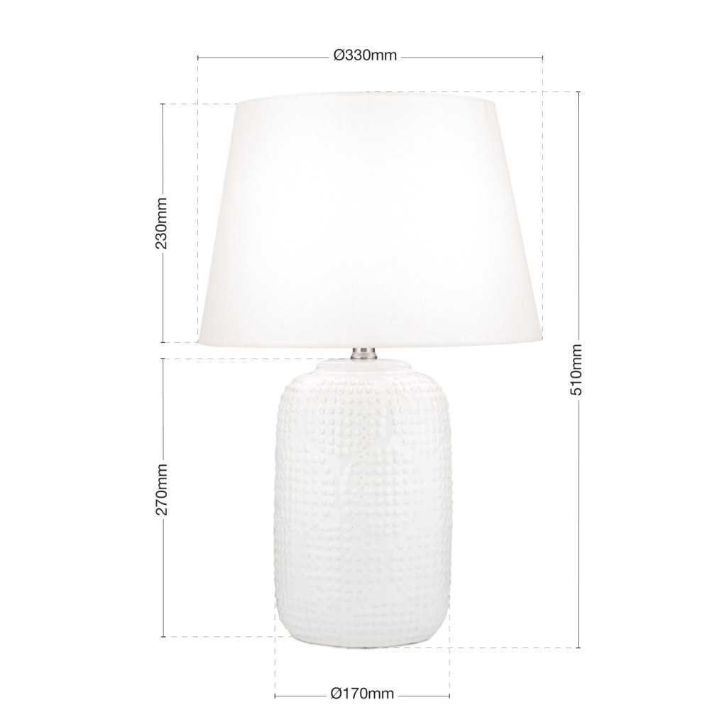 Coral Asztali lámpa 1x E27 Fehér Modern 33 cm remekül illik a modern enteriőrökbe. A fehér test kerámia kivitelű. A búra fehér árnyalatú. 1x E27 foglalattal szerelve. Cserélhető fényforrással használható. beltéri lámpa terekbe ajánlott.