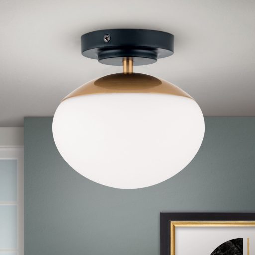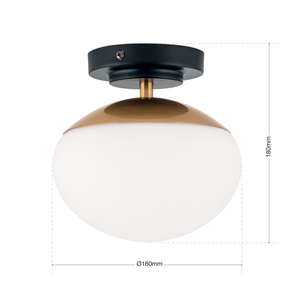 Josephine Mennyezeti lámpa 1x E27 Fekete/ matt arany Retro 18 cm remekül illik a retro enteriőrökbe. A fekete/ matt arany test fém kivitelű. A búra matt opál árnyalatú. 1x E27 foglalattal szerelve. Cserélhető fényforrással használható.