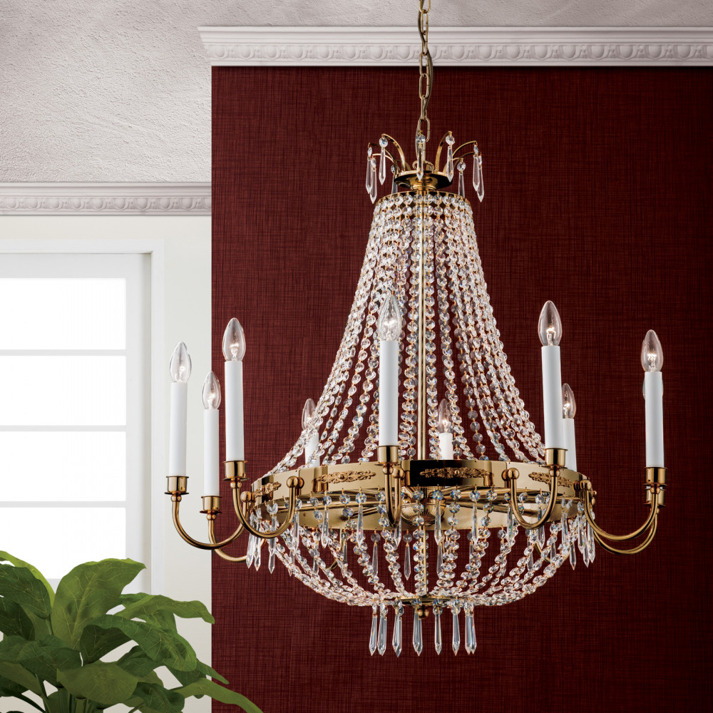 Az Empire Crystal kristály csillár, arany, 84 cm, 10xE14 megbízható és esztétikus választás otthoni vagy irodai használatra. Stílusát tekintve klasszikus-kristály, arany árnyalatban, sárgaréz anyagból készült. E14 foglalattal kompatibilis, így cserélhető fényforrással használható. A(z) Empire Crystal lámpacsalád tagja, így más kiegészítőkkel jól kombinálható.