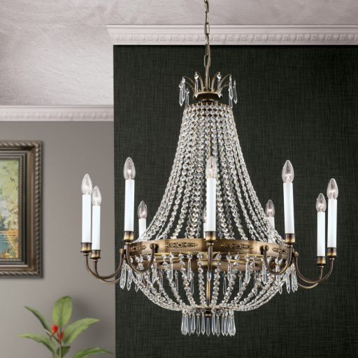 Az Empire Crystal kristály csillár, patina, 84 cm, 10xE14 megbízható és esztétikus választás otthoni vagy irodai használatra. Stílusát tekintve klasszikus-kristály, patina árnyalatban, sárgaréz anyagból készült. E14 foglalattal kompatibilis, így cserélhető fényforrással használható. A(z) Empire Crystal lámpacsalád tagja, így más kiegészítőkkel jól kombinálható.
