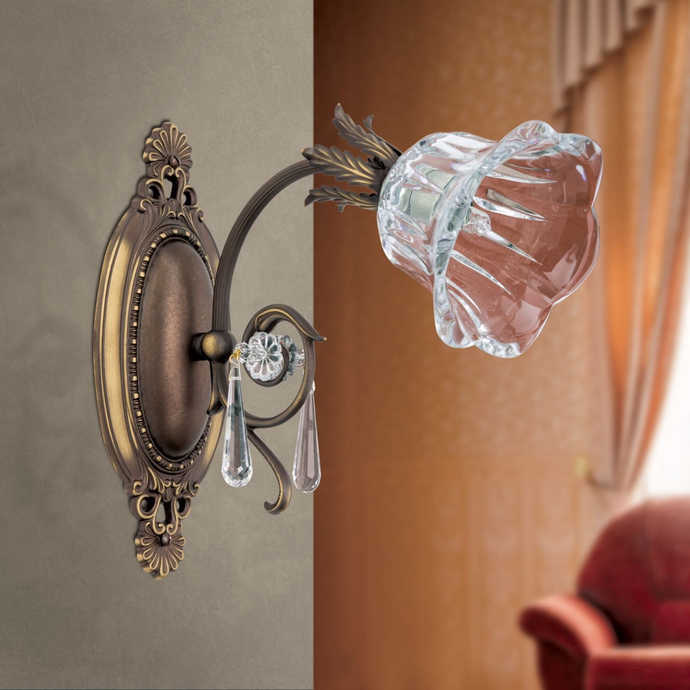 Boheme Fali lámpa 1x G9 Patina Klasszikus kristály remekül illik a klasszikus kristály enteriőrökbe. A patina test sárgaréz kivitelű. A búra átlátszó árnyalatú. 1x G9 foglalattal szerelve. Cserélhető fényforrással használható. beltéri lámpa terekbe ajánlott.